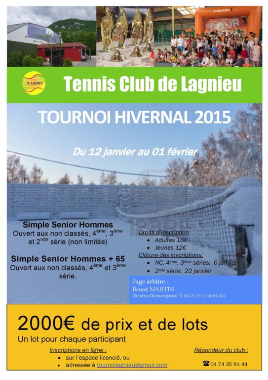 Le Tennis Club de Lagnieu sera heureux de vous accueillir pour son tournoi d'Hiver se déroulant du 12 Janvier au 1er Février 2015.