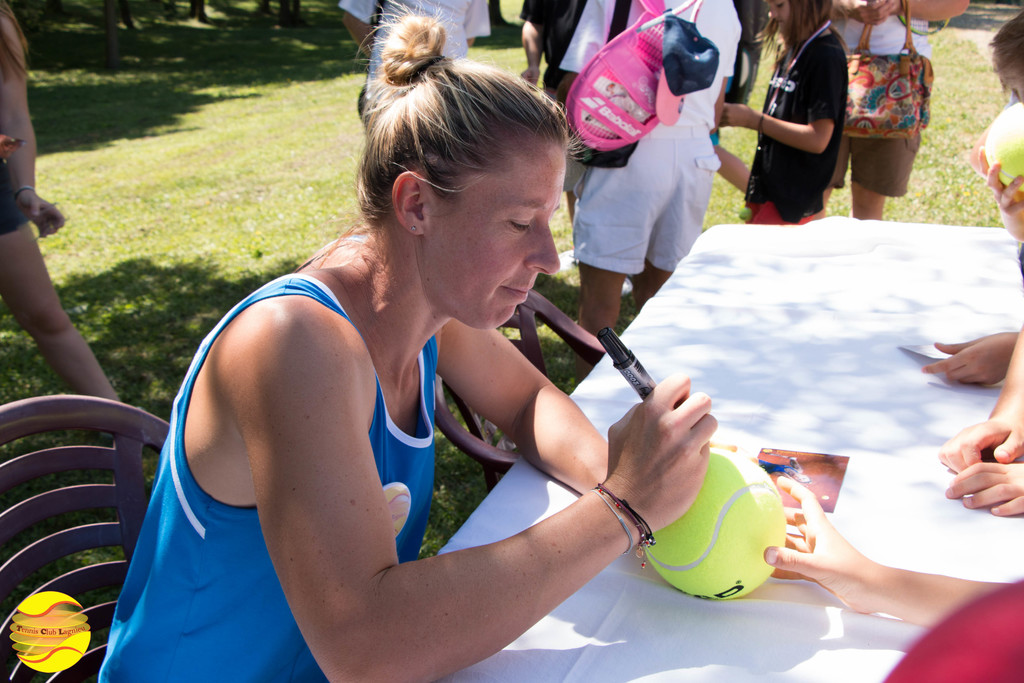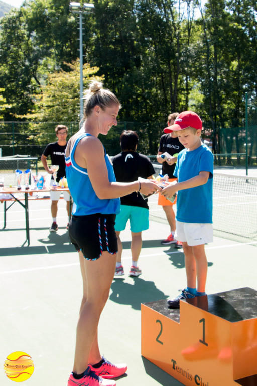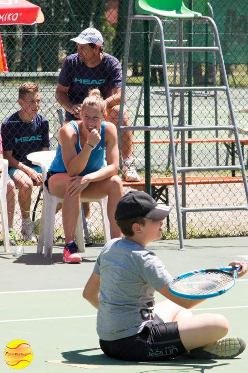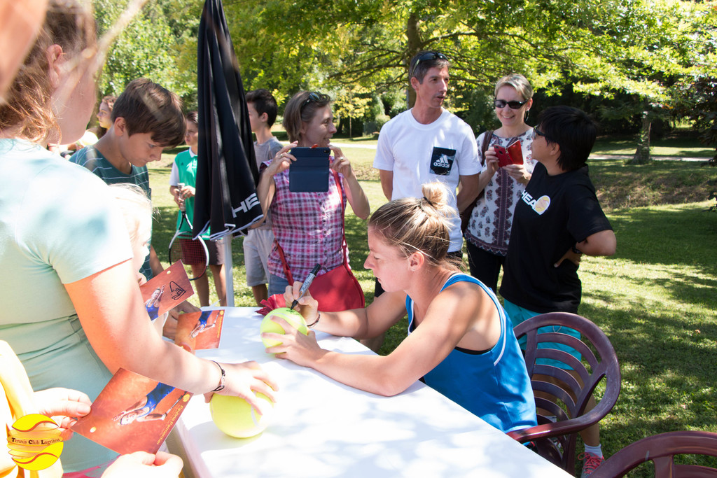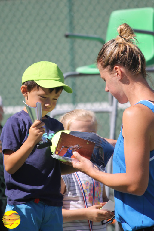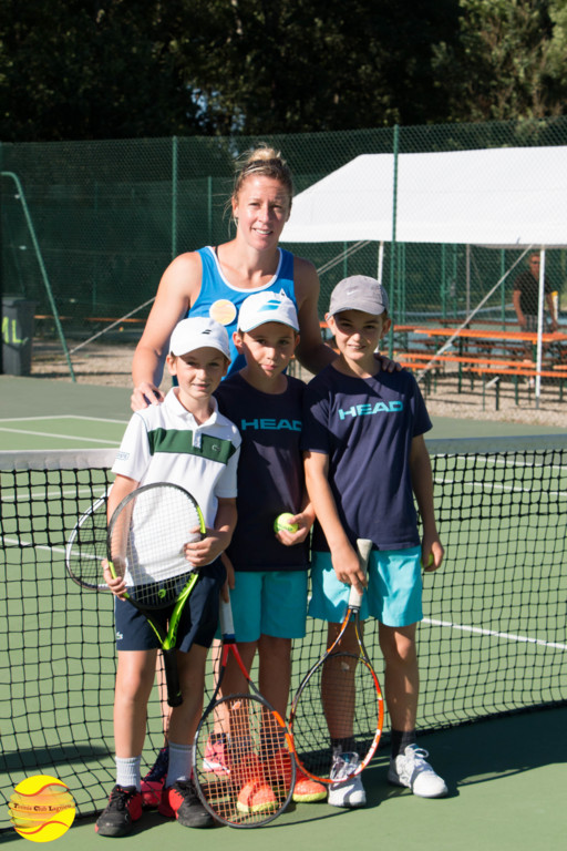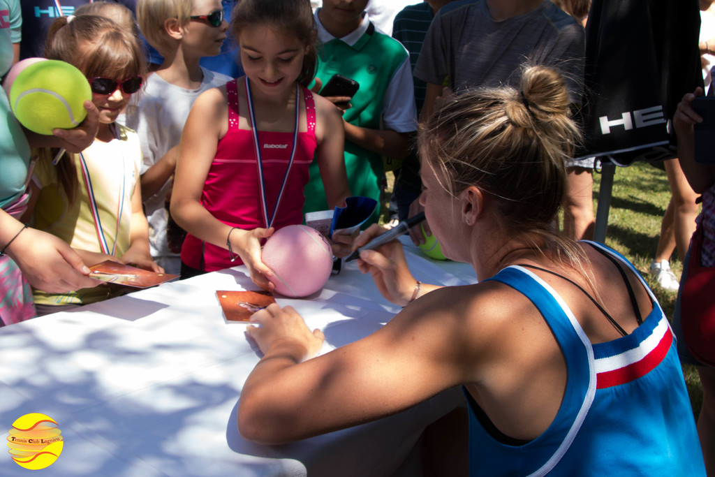 Elle a commencé par échanger quelques balles avec les enfants de l'école de tennis, un peu intimidés au départ puis libérés et heureux de cette occasion unique qui leur a été donnée. A l'issue, une petite séance de questions / réponses leur a permis de découvrir ce qu'était le sport de haut niveau.