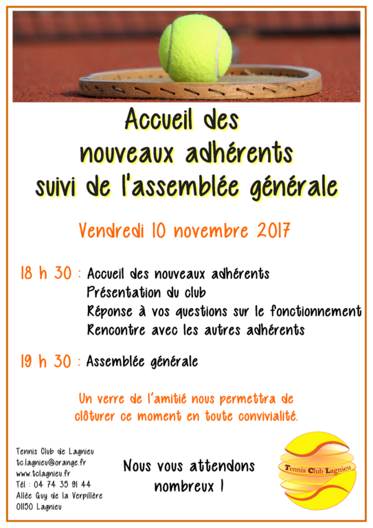 Le Tennis Club de Lagnieu tiendra son Assemblée générale le vendredi 10 novembre 2017 au clubhouse à 19h30.