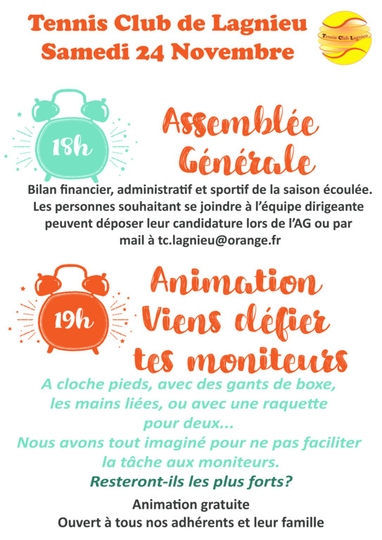 Le Tennis Club de Lagnieu tiendra son Assemblée générale le samedi 24 novembre 2018 au clubhouse à 18h.