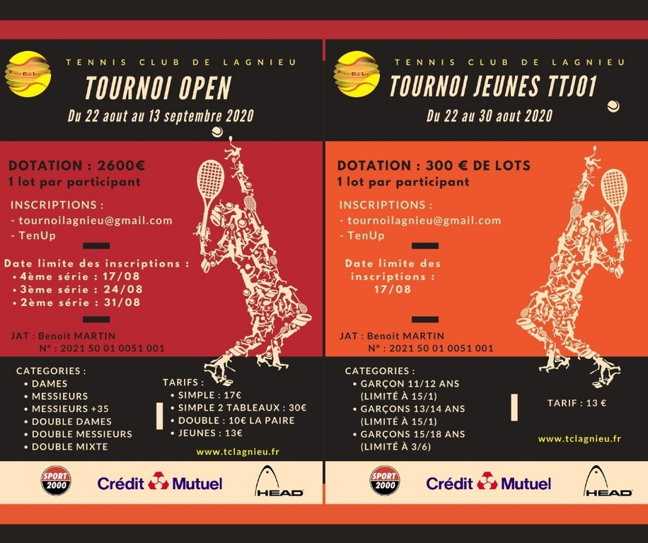 Le Tennis Club de Lagnieu sera heureux de vous accueillir pour ses 2 tournois d'été se déroulant du 22 août au 13 septembre 2020.