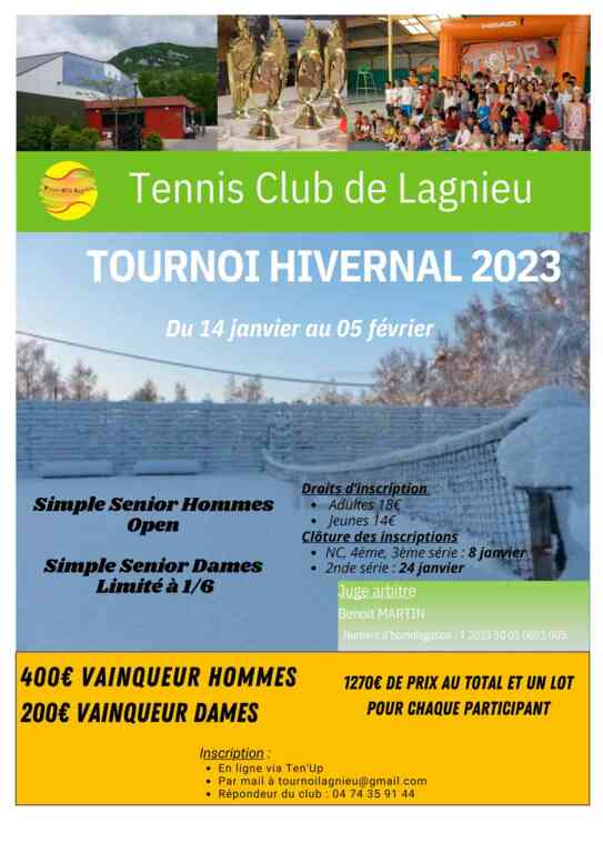 Le Tennis Club de Lagnieu sera heureux de vous accueillir pour son tournoi d'hiver se déroulant du 14 janvier au 5 février 2023